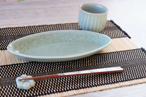 | 竹の質感と、ナチュラルで落ち着きのあるカラーが気に入っています。オーシャングリーンの丸皿25cmを乗せても、ゆとりのある大きさです。 | ||