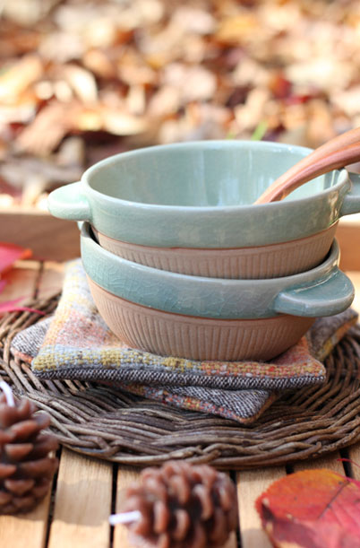 素焼きのあったかスープカップ ストライプ(12cm) ナチュラルグリーン